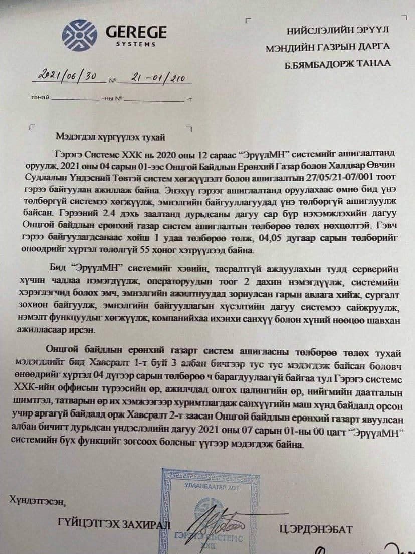 Тиймээс 2021 оны 7 сарын 1-ны 00.00 цагт “ЭрүүлМН” системийн бүх функцийг зогсоох болсныг үүгээр мэдэгдэж байна" гэжээ.