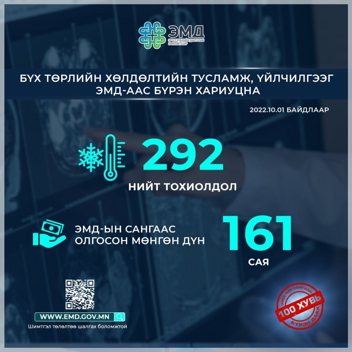 2022 оны эхний 10 сарын байдлаар энэхүү тусламж, үйлчилгээний 292 тохиолдол бүртгэгдэж, ЭМД-ын сангаас 161 сая төгрөгийн санхүүжилт олгосон байна.