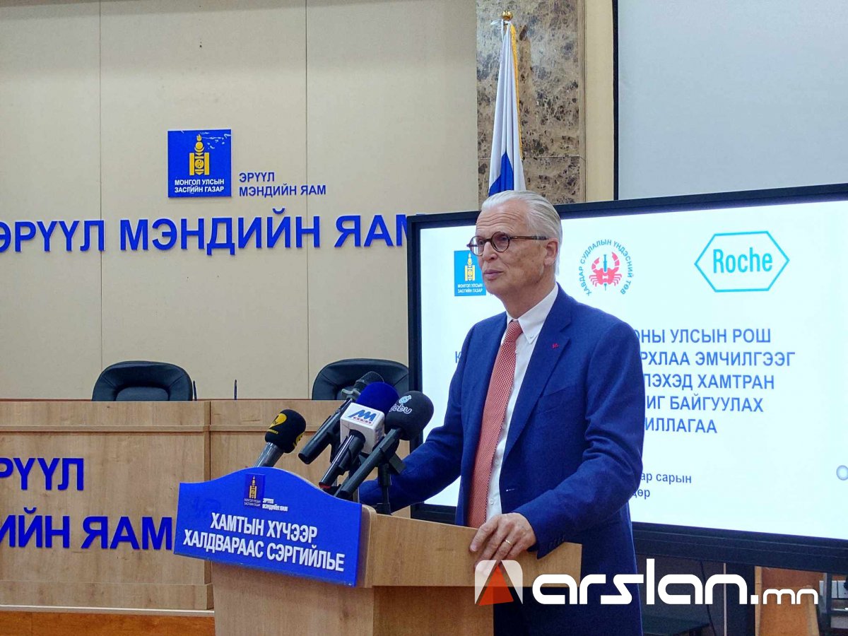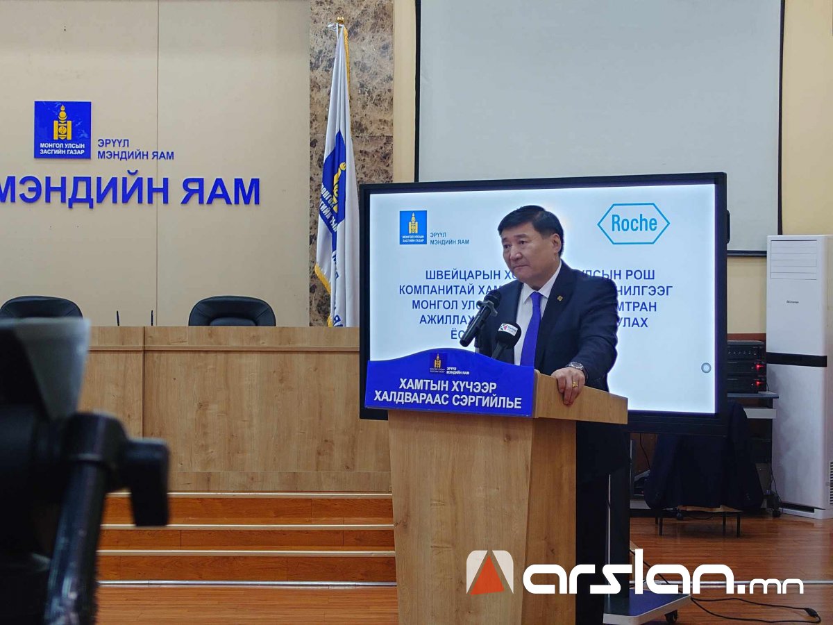 Санамж бичигт Эрүүл мэндийн сайд С.Чинзориг, ХСҮТ-ийн ерөнхий захирал Н.Эрдэнэхүү, Roche компанийн бүсийн дарга Адриано Треве нар өнөөдөр гарын үсэг зурж баталгаажуулав.