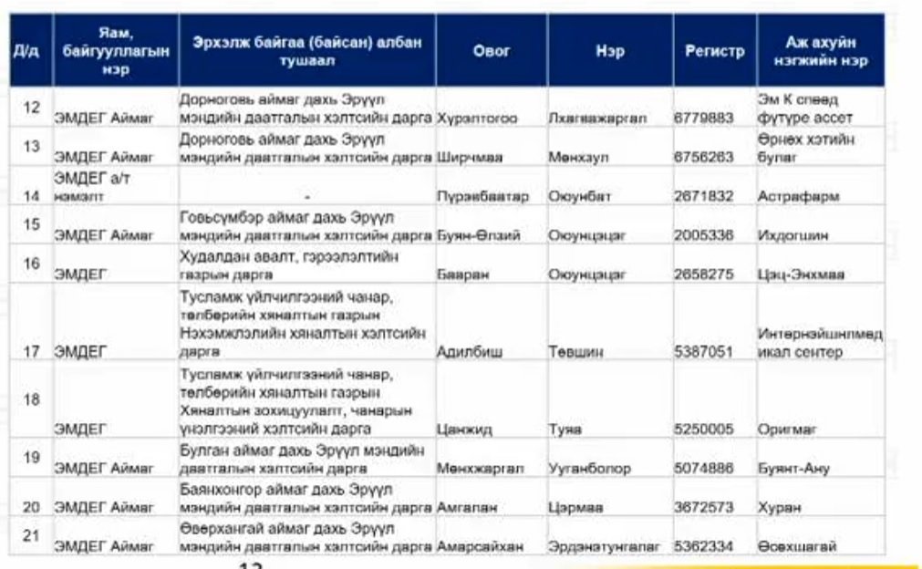 - эмийн сангийн 17 хувь нь төрийн байгууллагын эрх бүхий албан тушаалтны хамаарал бүхий ААН-үүд байна гэдгийг хэлээд төрийн байгууллага бүрээр хамаарлыг танилцуулсан юм.