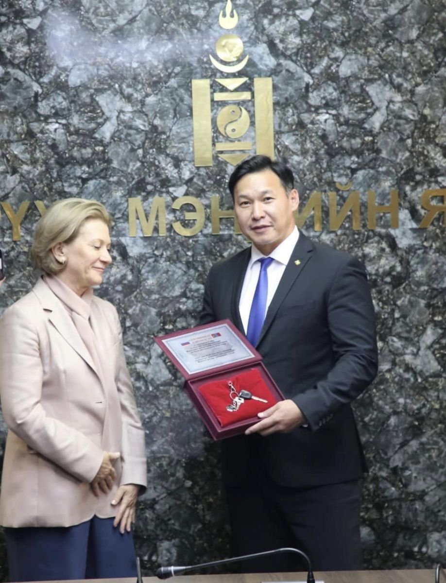 ОХУ-ын Хүний эрүүл мэнд, хэрэглэгчийн эрх ашгийг хамгаалах холбооны хяналтын газрын дарга, Ерөнхий эрүүл ахуйч эмч А.Ю.Попова Сайд Т.Мөнхсайханд хандан сайдын албан тушаалд томилогдсонд баяр хүргэж, цаашдын хамтын ажиллагааны чиглэлийн талаар санал солилцлоо. Тэрээр манай улсад ОХУ-ын Засгийн газрын санхүүжилтээр хэрэгжиж буй “Хилийн бүсийн халдварын эрсдэлийг бууруулах хөтөлбөр”-ийн хүрээнд зоонозын халдварт өвчнүүдийн лабораторийн оношилгоог газар дээр нь гүйцэтгэх, хариу арга хэмжээг цаг алдалгүй зохион байгуулахад чухал үүрэг гүйцэтгэх иж бүрэн тоноглогдсон лаборатори бүхий автомашины түлхүүрийг гардуулан өгснөөр уулзалт өндөрлөв.