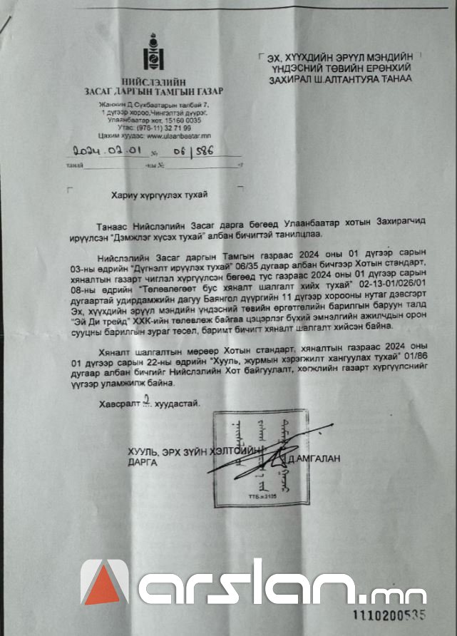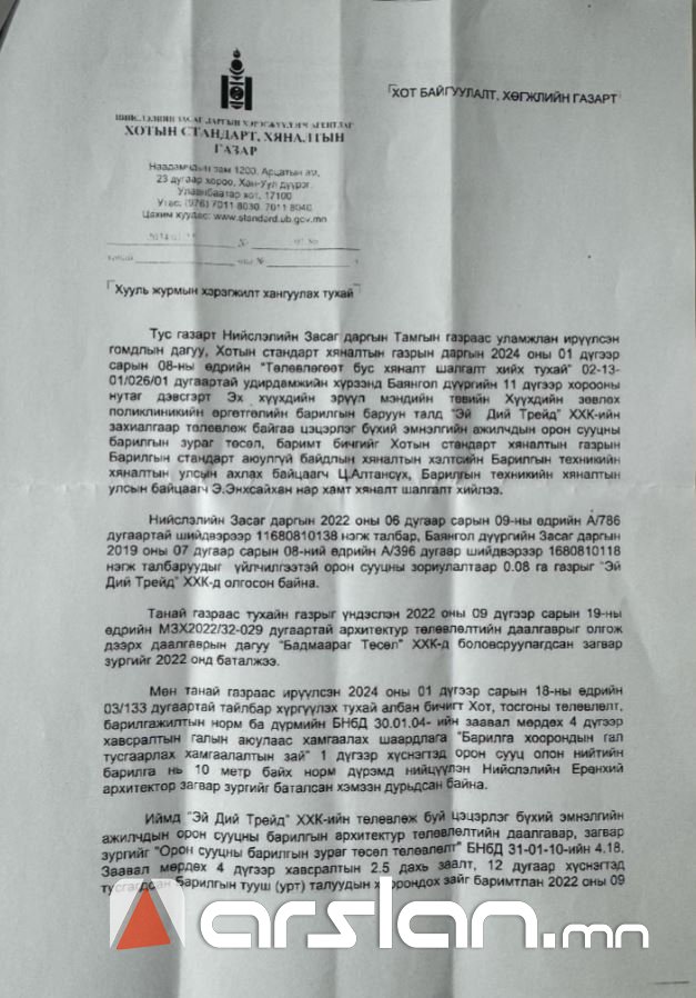 Тус баримтыг судлаж үзэхэд, ЭХЭМҮТ-ийн эмнэлгийн нэр ашиглаж, барилга барих загвар зураг гарган батлуулсан тус компаний барилгын ажлыг эсэргүүцэж, Нийслэлийн Засаг даргын тамгын газарт “Дэмжлэг хүсэх тухай” албан бичгийг явуулнаар НЗДТГ-аас шалгалт хийж, барилгажилтын норм ба дүрмийг зөрчсөн хэд хэдэн заалтыг үндэслэн архитектур төлөвлөлтийн даалгаврын загвар зургийг 2024 оны 02 дугаар сард цуцалсан гэнэ.