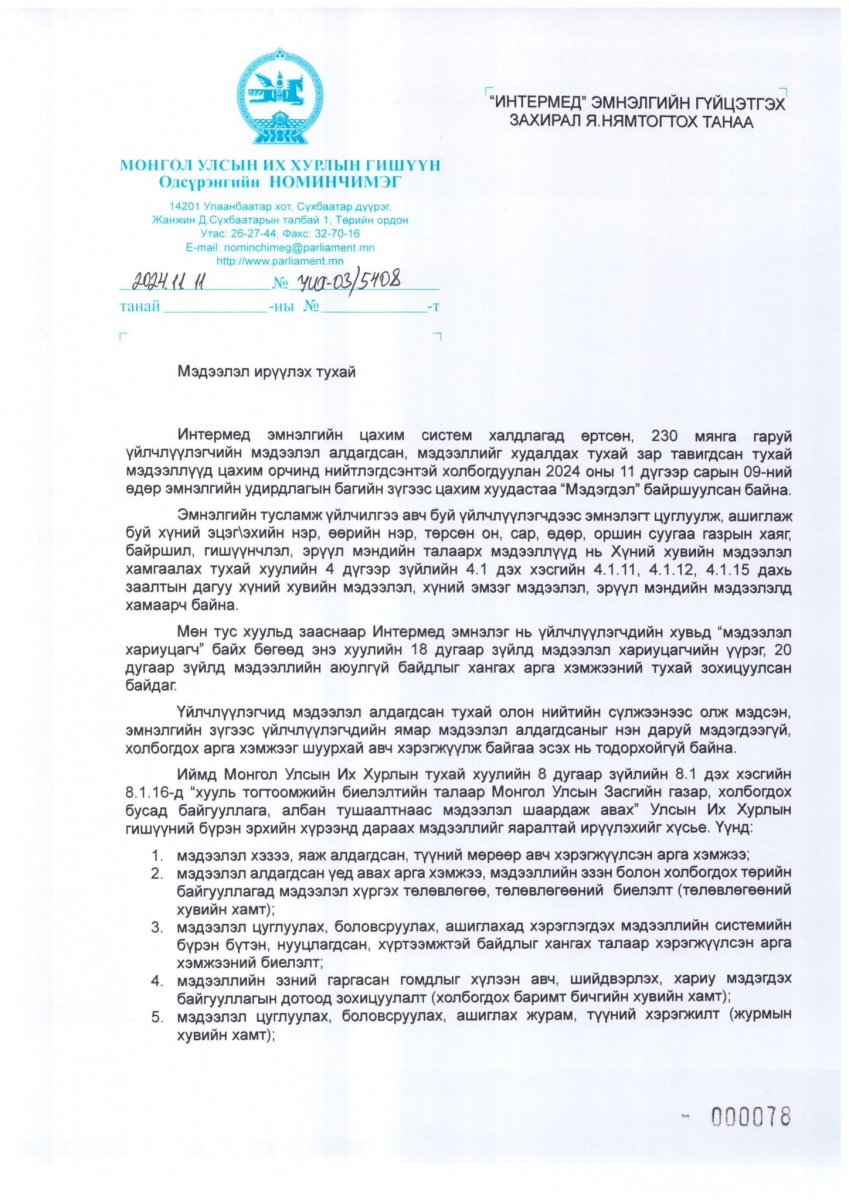 Энэ асуудлаар УИХ-ын гишүүн О.Номинчимэг "Иргэдээс ирсэн мэдээллээр Интермэд эмнэлэг 10 сарын 27-ноос өмнө үйлчлүүлэгчдийнхээ мэдээллийг алдсан байж болзошгүй байна. Гэтэл Хувь хүний мэдээллийг хамгаалах тухай хуулиар хэрэв "Интермед" эмнэлэг хүний эмзэг мэдээллийг алдсан бол тухайн иргэнд нэн даруй мэдэгдэх, тодорхой арга хэмжээг авч хэрэгжүүлэх үүрэгтэй ч үүнийгээ зөрчсөн байна.