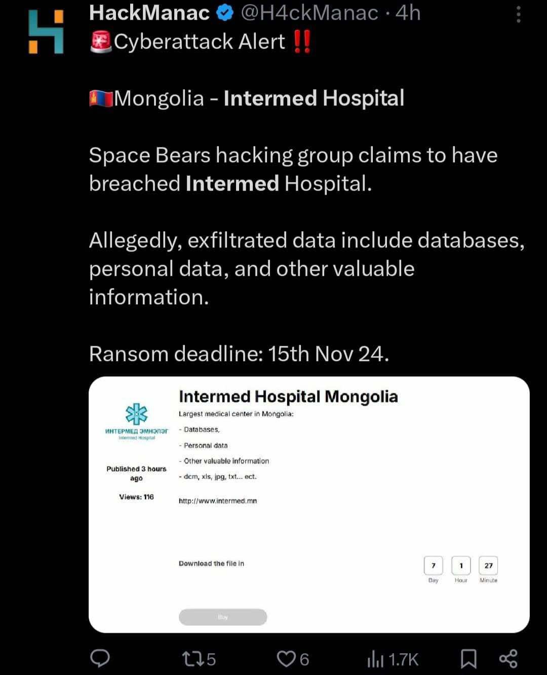 Тодруулбал, "Space Bears" хакерын бүлэглэл "Intermed Hospital Mongolia" хакердсан гэдгээ мэдэгдсэн тухай Цахим аюулгүй байдлын менежмент, заналхийллийн эсрэг үйл ажиллагаа явуулдаг HACKMANAC мэдээлсэн.