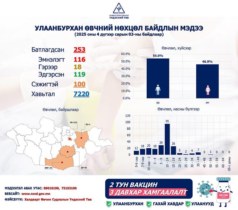 Өнөөдөр буюу 2025 оны 4 дүгээр сарын 03-ны байдлаар нийт улаанбурхан өвчний лабораториор батлагдсан 253, эмнэлэгт хэвтэн эмчлүүлж байгаа 116, гэрээр 18, эдгэрсэн 119, сэжигтэй тохиолдол нь 100, Хавьтал 7220 байгаа аж.