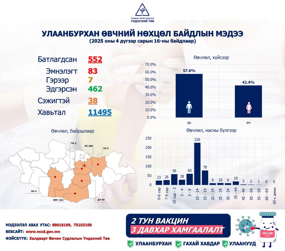 Өнөөдөр буюу 2025 оны 4 дүгээр сарын 14-ны байдлаар нийт улаанбурхан өвчний лабораториор батлагдсан 552, эмнэлэгт хэвтэн эмчлүүлж байгаа 83, гэрээр 7, эдгэрсэн 462, сэжигтэй тохиолдол нь 38, Хавьтал 11495 байгаа аж.
