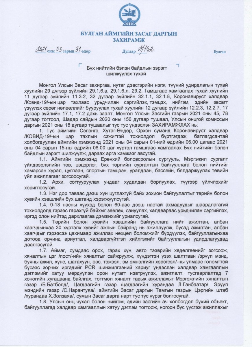 Аймаг, сумдаас орох, гарах хүн, авто тээврийн хөдөлгөөнийг зогсоож, постын хяналтыг сайжруулж, хүндэтгэн үзэх шалтгааны улмаас голомттой бүсээс зорчих иргэдийг PCR-ын шинжилгээний хариуг үндэслэн халдвар хамгааллын дэглэмийг хатуу мөрдүүлэн орон нутагт нэвтрүүлэх, ажиглалт, тусгаарлалтад долоо хоногийн хугацаанд байлгах, тогтмол хяналт тавих, хорио цээрийн дэглэмийн хэрэгжилтийг сахиулж, зөрчил гаргасан иргэн, аж ахуйн нэгж, байгууллагад холбогдох хууль тогтоомжийн дагуу хатуу хариуцлага тооцож ажиллахыг холбогдох байгууллагад даалгалаа.