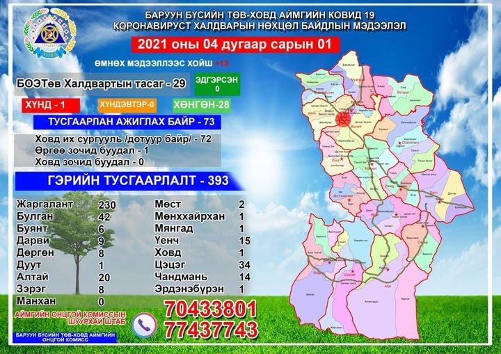 Ховд аймгийн Засаг даргын Тамгын газраас мэдээлснээр Ковид-19-ийн халдварын батлагдсан тохиолдлын тоо 29 болжээ. Эдгээр иргэнийг Бүсийн оношилгоо эмчилгээний төвд хэвтүүлэн эмчилж байгаа бөгөөд нэг хүний биеийн байдал хүнд байгаа гэлээ.