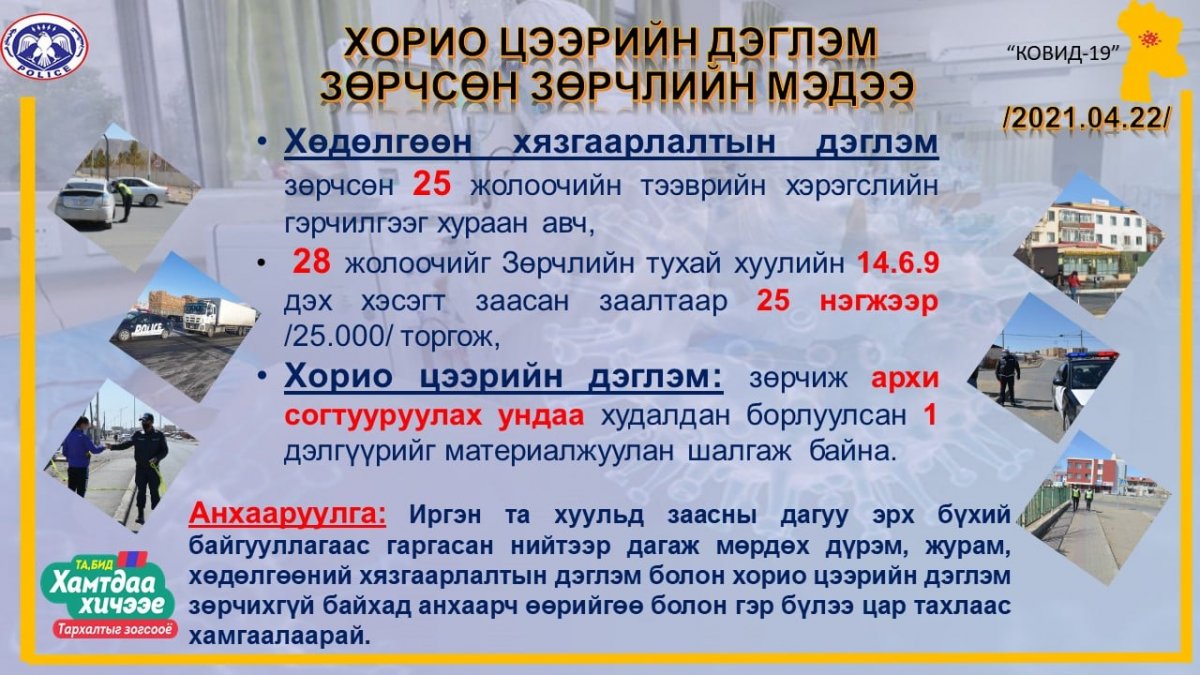 Өчигдөр буюу дөрөвдүгээр сарын 22-ны өдөр Баянхонгор аймагт хөдөлгөөний хязгаарлалтын дэглэм зөрчсөн 25 жолоочийн тээврийн хэрэгслийн хураан авч, 28 жолоочийг Зөрчлийн хуулиар 25000 мянган төгрөгөөр торгох арга хэмжээ авсан гэж аймгийн Цагдаагийн газраас мэдээллээ.