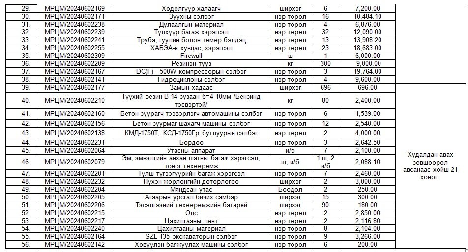 “Монголросцветмет” ТӨҮГ-т шаардлагатай шууд худалдан авалтын ЖАГСААЛТ-ыг танилцуулж байна.