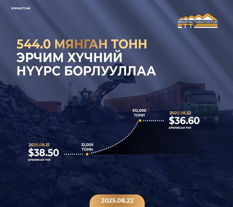 “Эрдэнэс Тавантолгой” ХК ордын нөөцийг бүрэн ашиглах, сорчлохгүй жигд борлуулах бодлого баримталж эрчим хүчний нүүрсний борлуулалтыг нэмэгдүүлсэн. 2025 оны 08 сарын 01-нээс 22-ний өдрийн хооронд нийт 19 удаагийн арилжааг амжилттай зохион байгуулж 90.9 сая ам.долларын үнэлгээ бүхий 1.7 сая тонн нүүрс Монголын Хөрөнгийн Биржээр арилжаалсны