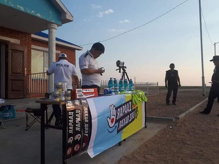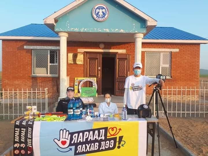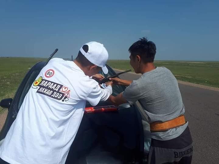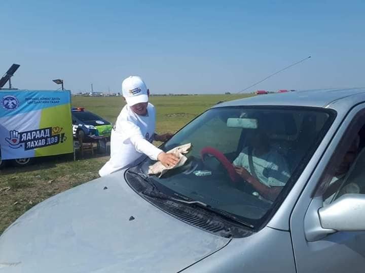Тэгвэл тус аяны хүрээнд Дорнод аймгийн Булган, Хөлөнбуйр сум хот хоорондын авто замаар дайран өнгөрч байгаа тээврийн хэрэгслүүдэд шил арчигчийн зориулалтын шингэн бэлэглэж, жолооч нарт анхааруулга бүхий зурагт хуудсыг тарааж ажиллаж байна.
