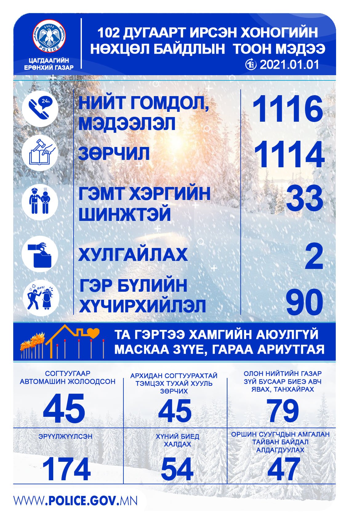 Мөн энэ өдөр нийт 1008 гомдол мэдээлэл ирсэн ба гэр бүлийн хүчирхийллийн 90, хулгайлах долоо, олон нийтийн газар биеэ зүй бусаар авч явж танхайрсан 79 зөрчил илэрсэн байна.