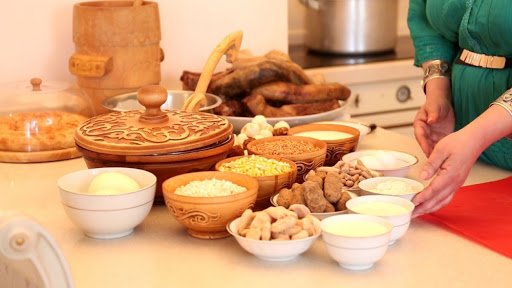 Наурызын баярын ширээнд мах, цагаан идээ, чихэр жимс гээд долоогоос доошгvй нэр төрлийн хоол байх учиртай. Түүний хамгийн чухал хоол бол Наурыз шөл юм. Уг шөлийг ус, мах, гурил, давс, будаа, өөх, сүү зэргээр хийдэг бөгөөд долоогоос доошгүй идээний дээж ордог байна. Будаатай шөл хийдгийн учир нь өсөж олуулаа болохыг бэлгэддэг ажээ. Мөн Наурыз шөлийг том тогоонд хийж олуулаа иддэг ёстой. Учир нь нэг тогооноос хоол идсэн хүмүүс эвтэй найртай байж найзалж нөхөрлөхийг бэлгэдсэн заншил юм.