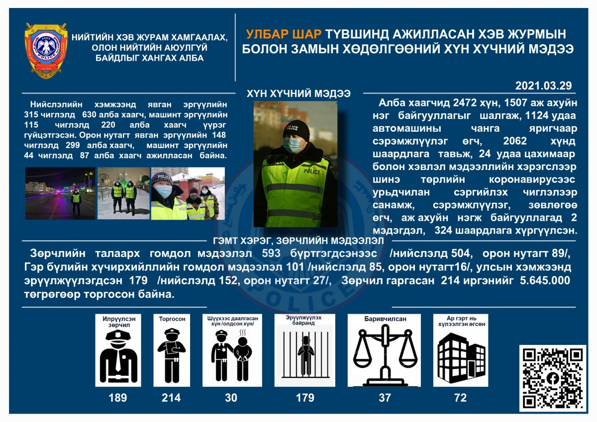 Алба хаагчид 2021 оны гуравдугаар сарын 29-ны өдөр 2472 иргэн, 1507 ААН-ийг шалгаж, шаардлага хүргүүлж ажилласан байна. Мөн зөрчлийн талаарх 593 гомдол мэдээлэл бүртгэгдсэнээс гэр бүлийн хүчирхийллийн шинжтэй 101 хэрэг бүртгэгджээ.