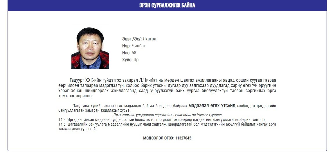 Тэрбээр мөрдөн шалгах ажиллагааны явцад оршин суугаа газраа өөрчилсөн талаар мэдэгдээгүй, холбоо барих дугаар руу нь залгахаар дуудлагад хариу өгөхгүй эрүүгийн хэрэг хянан шийдвэрлэх ажиллагаанд саад учруулахгүй байх үүргээ биелүүлэхгүй, таслан сэргийлэх арга хэмжээг зөрчсөн учраас ийнхүү эрэн сурвалжилж байгаа аж.