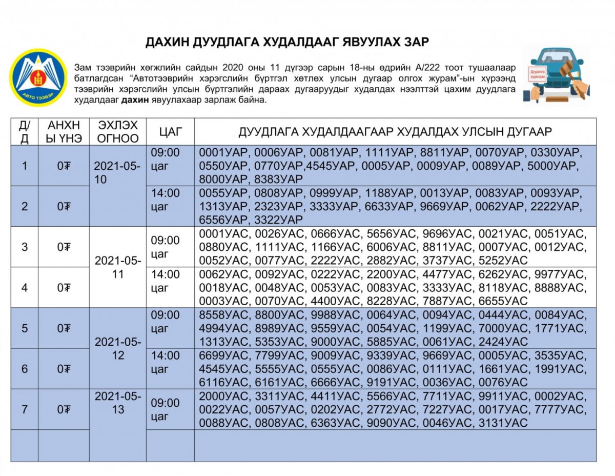 Зам тээврийн хөгжлийн сайдын 2020 оны 11 дүгээр сарын 18-ны өдрийн А/222 тоот тушаалаар батлагдсан “Автотээврийн хэрэгслийн бүртгэл хөтлөх улсын дугаар олгох журам”-ын хүрээнд тээврийн хэрэгслийн улсын бүртгэлийн дараах дугааруудыг худалдах нээлттэй цахим дуудлага худалдааг дахин зарлалаа.