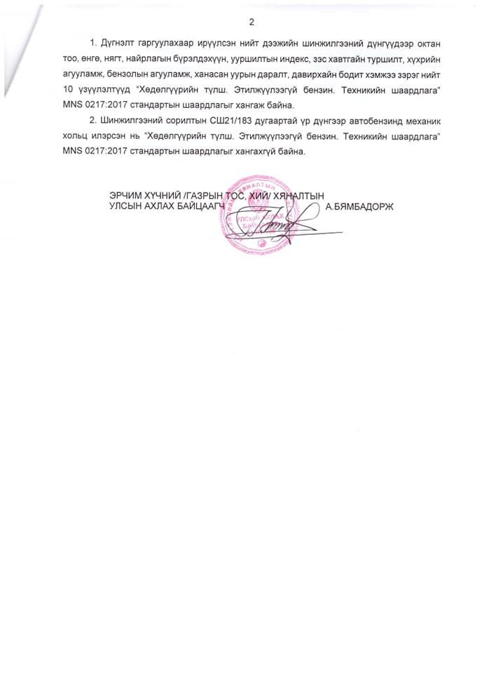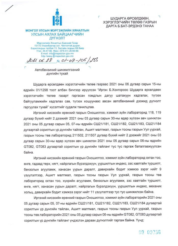 Шалгалтаар шатахуун түгээх станцын дээжнээс механик хольц илэрсэн, стандартын шаардлага хангаагүй дүгнэлт гарсан байна.