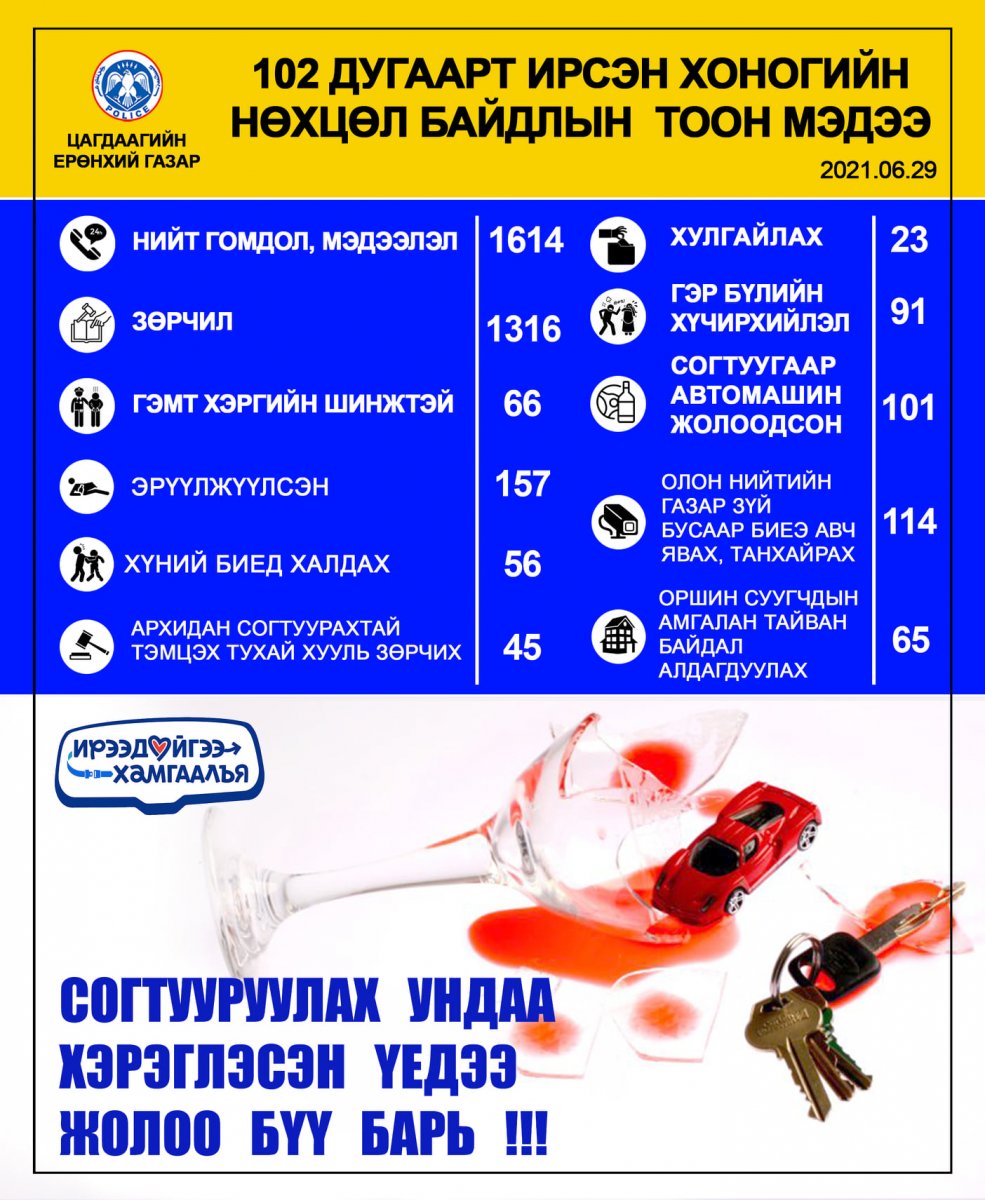 Өчигдөр буюу 06 дугаар сарын 30-ны өдөр Цагдаагийн байгууллагын 102 дугаарт нийт 1614 гомдол, мэдээлэл иржээ. Үүнээс зөрчлийн дуудлага 1316 байсан бол гэр бүлийн хүчирхийллийн дуудлага 91 байсан аж. Мөн хулгайлах гэмт хэрэг 23, гэмт хэргийн шинжтэй 66 үйлдэл бүртгэгджээ.