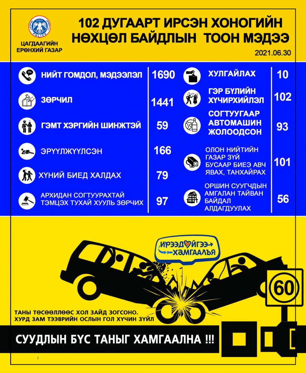 Өчигдөр буюу 06 дугаар сарын 30-ны өдөр Цагдаагийн байгууллагын 102 дугаарт нийт 1690 гомдол, мэдээлэл иржээ. Үүнээс зөрчлийн дуудлага 1441 байсан бол гэр бүлийн хүчирхийллийн дуудлага 102 байсан аж. Мөн хулгайлах гэмт хэрэг 10, гэмт хэргийн шинжтэй 59 үйлдэл бүртгэгджээ.