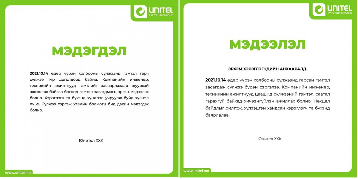 Үүрэн телефоны оператор "Юнител" компанийн сүлжээ өнөөдөр /2021.10.14/ орон даяар гацаж, гэмтэл гарсан талаар мэдэгджээ.