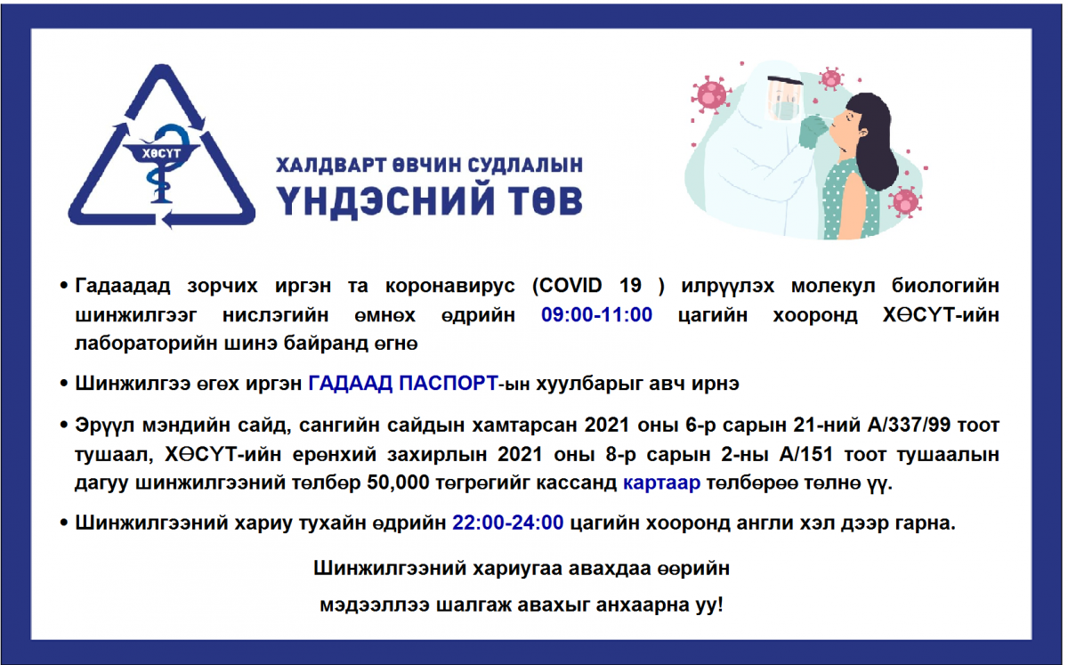 - Гадаадад зорчих иргэн та коронавирус илрүүлэх молекул биологийн шинжилгээг нислэгийн өмнөх өдрийн 09:00-11:00 цагийн хооронд ХӨСҮТ-ийн лаброторийн шинэ байранд өгнө.