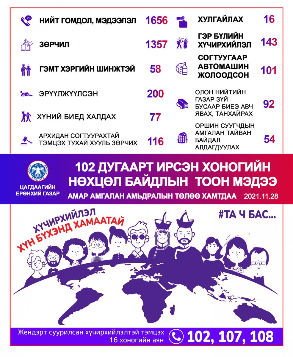 Цагдаагийн байгууллагад 2021 оны 11 дүгээр сарын 28-ны өдөр ирсэн дуудлага, мэдээллийг хүргэж байна. Хоногийн хугацаанд нийт 1656 гомдол мэдээлэл ирсэн бөгөөд үүнээс зөрчлийн шинжтэй 1357, гэмт хэргийн шинжтэй 58 дуудлага мэдээлэл бүртгэгдсэн байна.