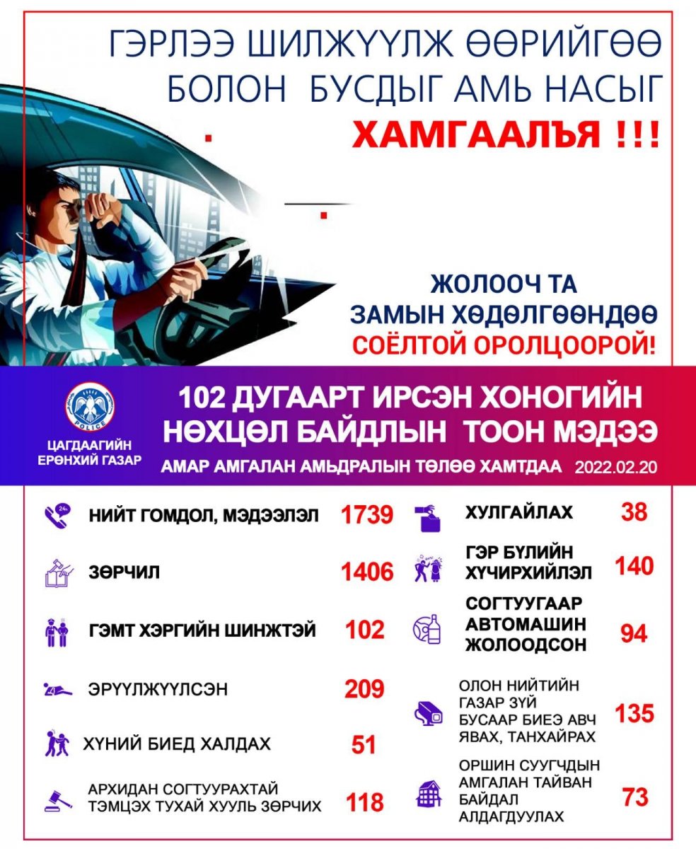 Цагдаагийн байгууллагын 102 дугаарт өчигдөр /2021.02.21/ 1739 гомдол мэдээлэл иржээ. Үүний 1406 нь зөрчлийн шинжтэй, 102 нь гэмт хэргийн шинжтэй дуудлага байна.
