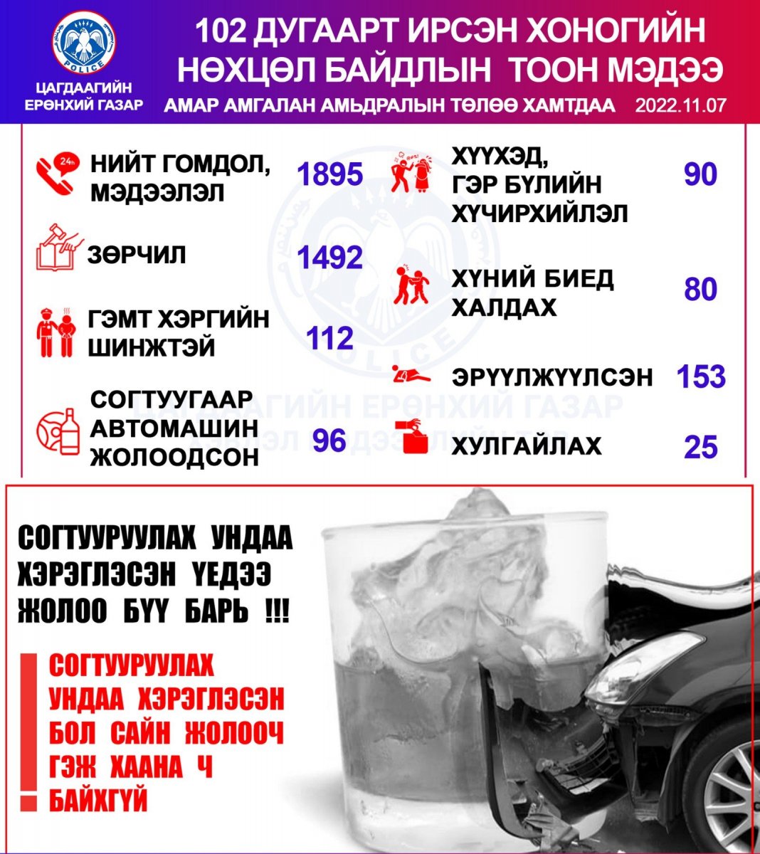 Энэ сарын 07-нд буюу өчигдөр цагдаагийн байгууллагын 102 дугаарын утсанд нийт 1895 гомдол мэдээлэл бүртгэгджээ. Үүнээс зөрчлийн дуудлага мэдээлэл 1492, хулгайтай холбоотой 25, хүүхэд, гэр бүлийн хүчирхийллийн дуудлага 90, гэмт хэргийн шинжтэй 112 мэдээлэл бүртгэгдсэн байна.