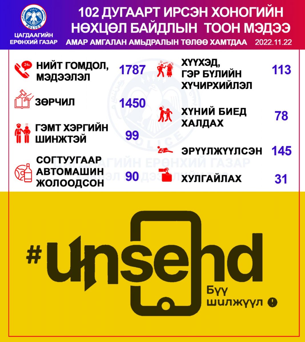 Үүнээс зөрчлийн дуудлага мэдээлэл 1450, хулгайтай холбоотой 31, хүүхэд, гэр бүлийн хүчирхийллийн дуудлага 113, гэмт хэргийн шинжтэй 99 мэдээлэл бүртгэгдсэн байна.