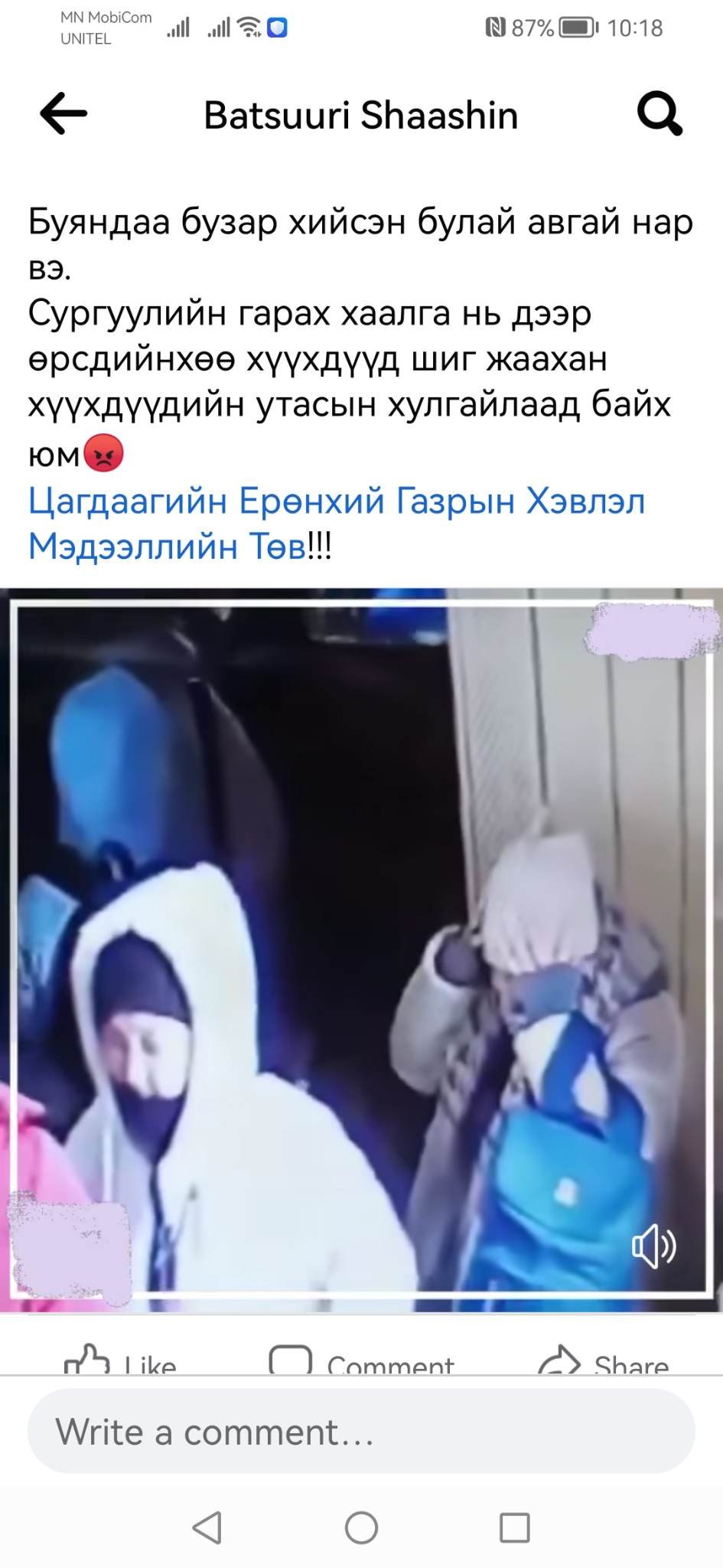 Цагдаагийн байгууллагаас олон нийтийн цахим сүлжээнд нийтлэгдсэн сурагчийн гар утсыг халааснаас нь хулгайлан авч байгаа бичлэгийн мөрөөр шалгалтын ажиллагааг явуулжээ.