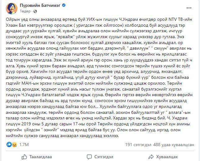 Ч.Ундрам гишүүн 2019 оны тавдугаар сарын 17-ны орой Төрийн ордонд үйлдэгдсэн ноцтой хүн амины хэргийг үйлдсэн “эзнийг” мэдээд яриад байгаа бус уу" хэмээн цахим хуудсандаа бичжээ.