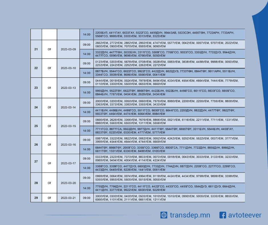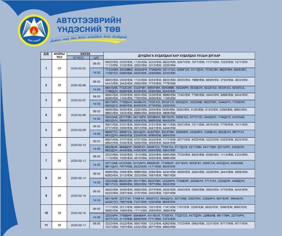 Зам, тээврийн хөгжлийн сайдын 2020 оны 11 дүгээр сарын 18-ны өдрийн А/222 тоот тушаалаар батлагдсан “Автотээврийн хэрэгслийн бүртгэл хөтлөх улсын дугаар олгох журам”, 2022 оны 07 дугаар сарын 06-ны өдрийн А/207 тоот тушаалаар батлагдсан “Тээврийн хэрэгслийн бүртгэлийн дугаарын дуудлага худалдааг зохион байгуулах журам”-ын хүрээнд тээврийн хэрэгслийн улсын бүртгэлийн дараах дугааруудыг худалдах нээлттэй цахим дуудлага худалдааг зарлаж байна.