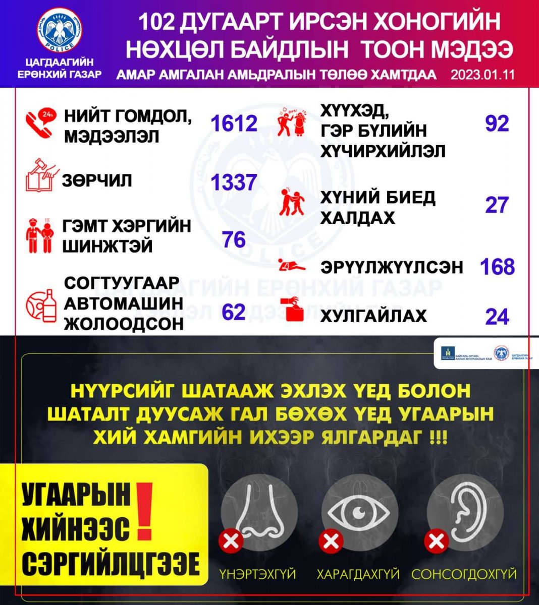 Энэ сарын 11-нд буюу өчигдөр цагдаагийн байгууллагын 102 дугаарын утсанд нийт 1612 гомдол мэдээлэл бүртгэгджээ. Үүнээс зөрчлийн дуудлага мэдээлэл 1337, хулгайтай холбоотой 24, хүүхэд, гэр бүлийн хүчирхийллийн дуудлага 86, гэмт хэргийн шинжтэй 92 мэдээлэл бүртгэгдсэн байна.