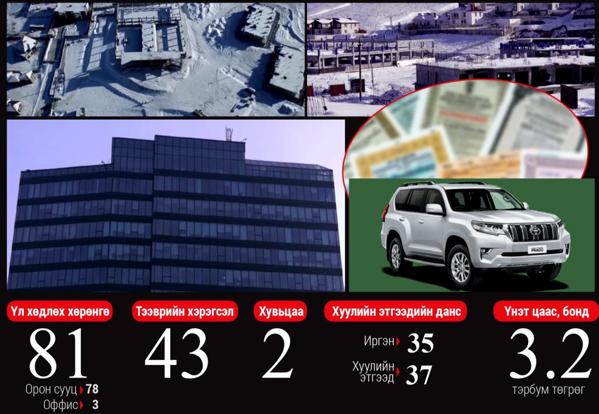 Мөрдөн шалгах ажиллагааны явцад одоогоор 81 үл хөдлөх хөрөнгө байна. Тодруулбал, 78 орон сууц, оффисын гурван талбай, 43 тээврийн хэрэгслийн шилжилт хөдөлгөөнийг хязгаарласан, дөрвөн газар, хоёр хуулийн этгээдийн хувьцаа, 35 иргэн, 37 хуулийг этгээдийн арилжааны банк дахь дансны зарлагын гүйлгээ, дөрвөн иргэний 3.2 тэрбум төгрөгийн үнэлгээ бүхий үнэт цаасыг битүүмжилсэн. Нүүрсний хулгайн сэжигтэн Хан-Уул дүүрэгт спорт комплекс барьсан нь тогтоогджээ.
