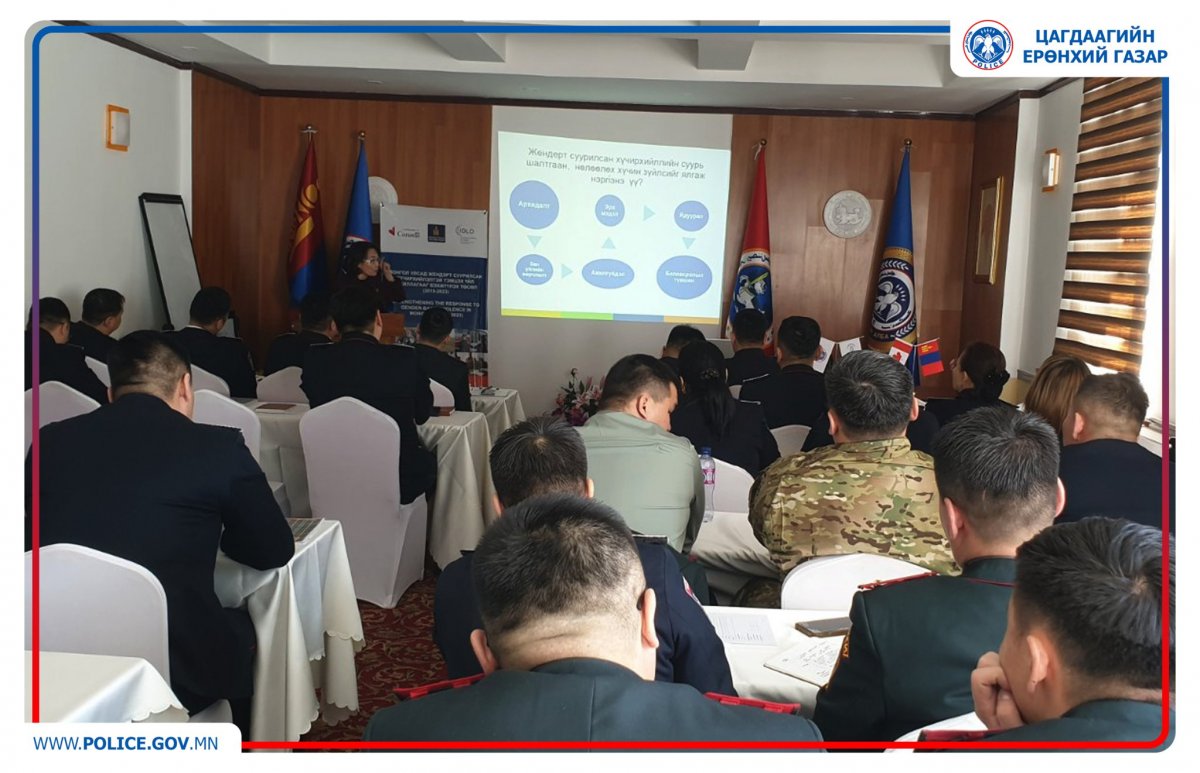 Цагдаа, дотоодын цэргийн байгууллагын сургалт хариуцсан алба хаагчдын мэдлэг, багаар ажиллах ур чадварыг дээшлүүлэх, ажлын бүтээмжийг нэмэгдүүлэх, чадварлаг, мэргэшсэн хүний нөөцийг бүрдүүлэх, сургалтын үр нөлөөг дээшлүүлэх зорилгоор энэ сарын 16, 17-ны өдрүүдэд Гэр бүлийн хүчирхийлэл, Жендерт суурилсан хүчирхийлэл, Хохирогч болон хүчирхийлэл үйлдэгчид үзүүлэх үйлчилгээ, Гэр бүлийн хүчирхийллээс урьдчилан сэргийлэхэд цагдаагийн алба хаагчийн оролцоо, Гэр бүлийн хүчирхийлэлтэй тэмцэхэд цагдаагийн алба хаагчийн хохирогч төвтэй хандлага, Дуудлага хүлээн авах, зөрчил шалган шийдвэрлэх зэрэг сэдвийн хүрээнд сургалт зохион байгуулж байна.