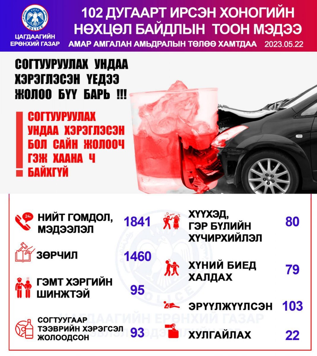 Өчигдөр буюу 05 сарын 22-нд буюу цагдаагийн байгууллагын 102 дугаарын утсанд нийт 1841 гомдол мэдээлэл бүртгэгджээ. Үүнээс зөрчлийн дуудлага мэдээлэл 1460, хулгайтай холбоотой 22, хүүхэд, гэр бүлийн хүчирхийллийн дуудлага 80, гэмт хэргийн шинжтэй 95 мэдээлэл бүртгэгдсэн байна.