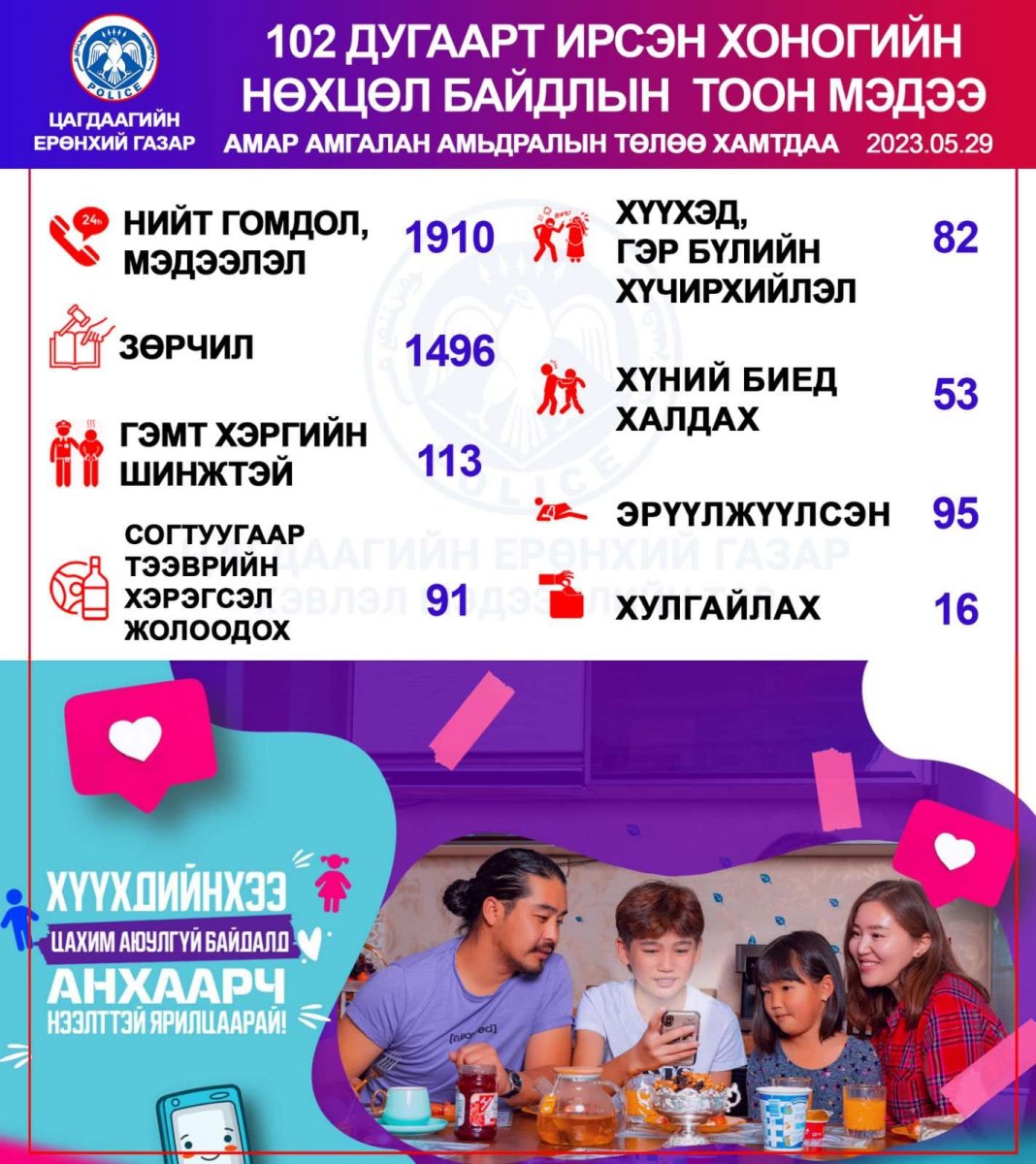 Өчигдөр буюу 05 сарын 29-нд буюу цагдаагийн байгууллагын 102 дугаарын утсанд нийт 1910 гомдол мэдээлэл бүртгэгджээ. Үүнээс зөрчлийн дуудлага мэдээлэл 1496, хулгайтай холбоотой 16, хүүхэд, гэр бүлийн хүчирхийллийн дуудлага 82, гэмт хэргийн шинжтэй 113 мэдээлэл бүртгэгдсэн байна.