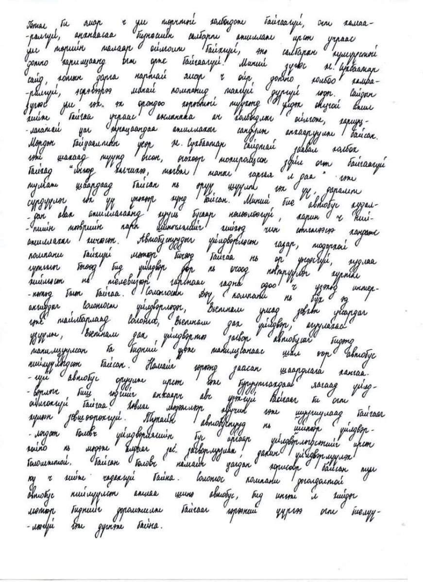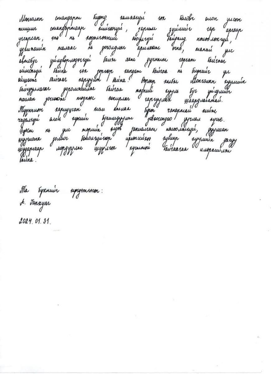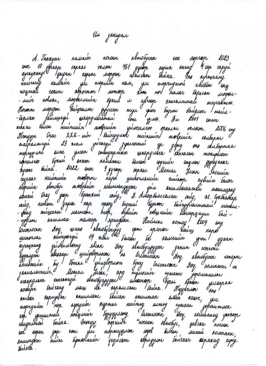 Тэгвэл тэрбээр хорих ангиас захиа бичсэн нь олон нийтэд ил болоод байна. Тэрбээр захиандаа "Би автобусны парк шинэчлэл хийхийн тулд чин сэтгэлээсээ ажилласан. Солонгосын Дэү компани нь бүх эд ангиудаа солонгост үйлдвэрлээд Вьетнамд угсардаг гэж ярьсан. Тэр үеэр хийсэн телевизийн нэвтрүүлэг ч байгаа. ...Ж.Сүхбаатар сайдтай заавал холбох гэж шалаад Ингээд хэлчих тэгвэл таныг гаргая гэсэн " хэмээн дурджээ.