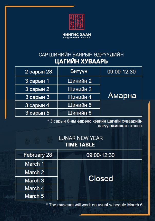 Чингис хаан Үндэсний музей энэ сарын 6-ны өдөр буюу өнөөдрөөс тогтсон цагийн хуваарийн дагуу ажиллана.