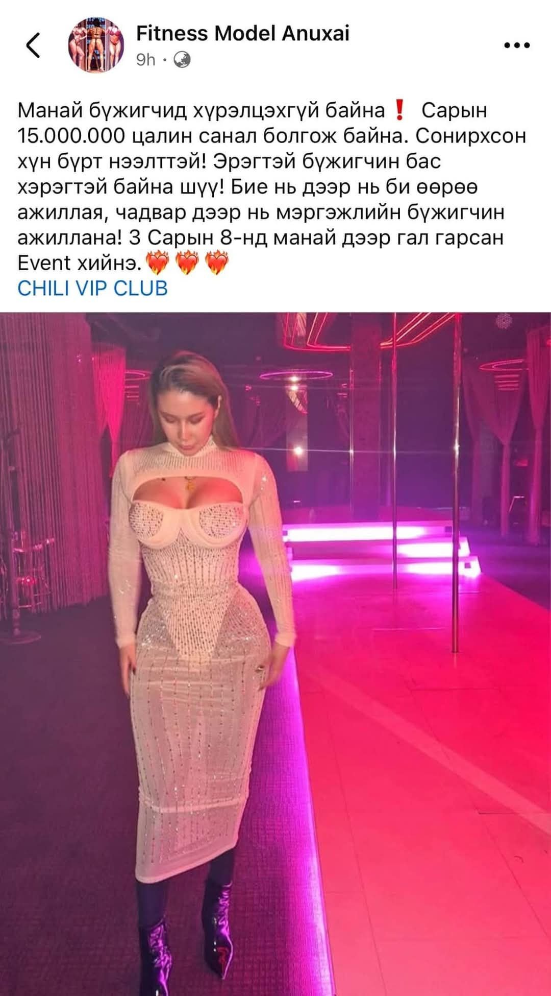 Та одоо ажлаа хийгээд хэдийг олж байна тайчвал яг тийм л олно. Энэ чинь бас гоо зүй, шон дээр бүжиглэх авьяас, эрчүүдийг татах, хамт хошгоруулж уулгах, уух, шөнөжин хөх бөгсөө бариулах гээд амаргүй ажил." гэжээ.