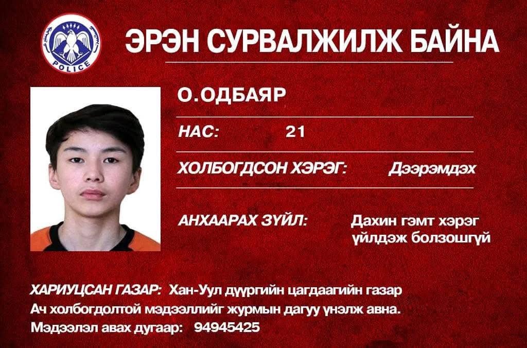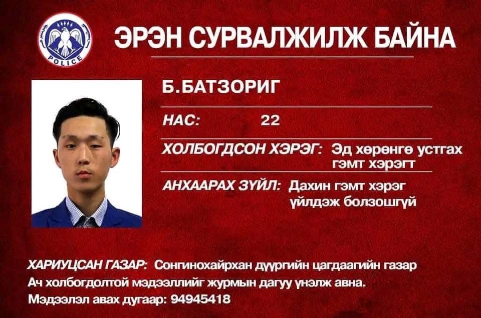- эд хөрөнгө устгах гэмт хэрэгт холбогдсон 22 настай Б.Б нарыг эрэн сурвалжилж байна.