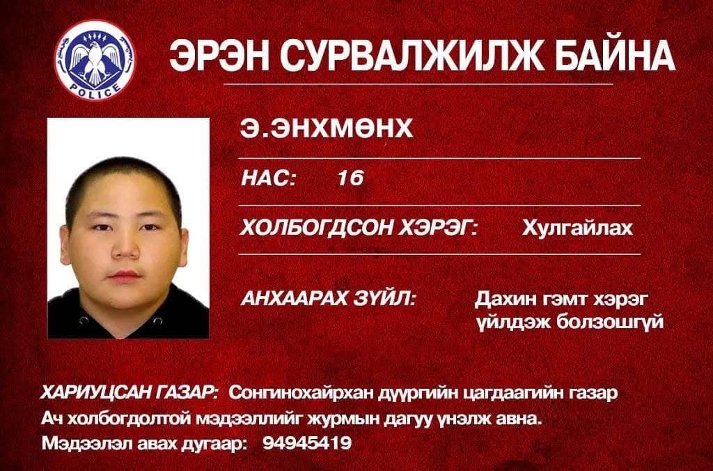 Хулгайлах, дээрэмдэх, эд хөрөнгө устгах гэмт хэрэгт холбогдсон 16-22 настай дараах этгээдүүдийг дахин гэмт хэрэг үйлдэж болзошгүй гэх үндэслэлээр цагдаагийн байгууллагаас эрэн сурвалжилж байна.