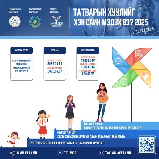 Оролцох багуудын мэдүүлгийг 2025 оны 4 дүгээр сарын 22-ний өдрийг дуустал taxlaw@cpta.mn хаягаар хүлээн авна.