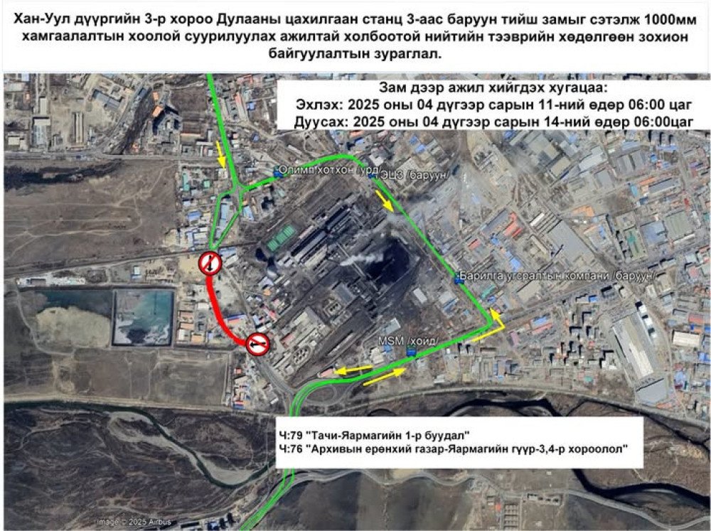 Харин хойноос урагш чиглэлийг “ДЦС-3” ТӨХК-ийн баруун хойд талын буцах уулзвараар эргэж, “ДЦС-3” ТӨХК-ийн хойд болон зүүн талын замаар үндсэн хөдөлгөөнд оролцох боломжтойгоор хөдөлгөөнийг түр зохицуулах юм. Иймд авто замын ажил хийгдэх явцад нийтийн тээврээр зорчигч иргэд та бүхэн 2024 оны дөрөвдүгээр сарын 11-14-ний 06:00 цаг хүртэл доорх зураглалын дагуу зорчилтоо төлөвлөнө үү. Нийтийн тээврийн үйлчилгээтэй холбоотой санал, хүсэлтийг тус газрын 70044040 дугаарын утсаар тогтмол хүлээн авч, шуурхай шийдвэрлэнэ гэж Нийтийн тээврийн бодлогын газраас мэдээллээ.