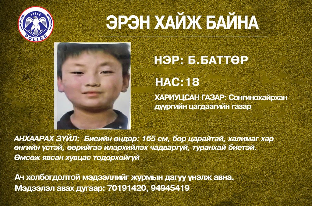 Өөрийгөө илэрхийлэх чадваргүй 18 настай Б.Баттөрийг цагдаагийн байгууллагаас эрэн хайж байна. Түүний хувьд 165 см өндөртэй, бор царайтай, халимаг хар өнгийн үстэй, туранхай биетэй аж.