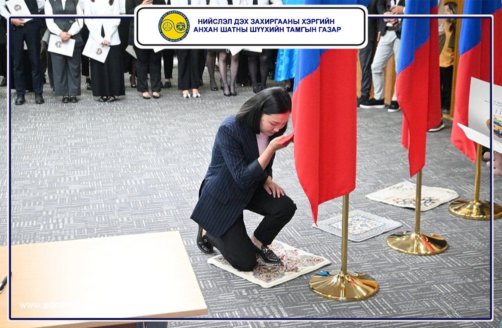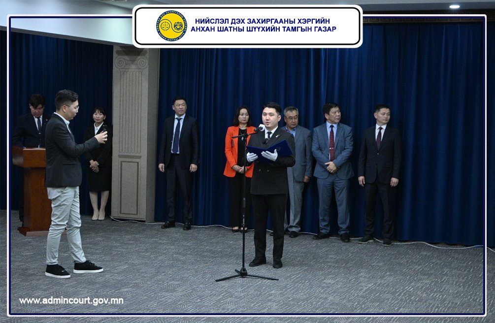 Монгол улсын төрийн захиргааны албан хаагчийн тангаргийг Нийслэл дэх Захиргааны хэргийн анхан шатны шүүгчийн туслах Б.Цогтбаяр уншиж сонордуулан Төрийн дуулал эгшиглэж, Шүүгчийн туслах Г.Байгалмаа, Э.Мөнхзавъяа, М.Мөнцэцэг, Б.Оюунтунгалаг, Н.Лхамноров, Б.Цогтбаяр, Х.Цэцэгсүрэн, Б.Цэрэнханд, Шүүх хуралдааны нарийн бичгийн дарга Б.Баатарзориг, Б.Бөртэ-Үжин, Б.Мандах, Э.Оюунбилэг, Б.Уранбилэг, Б.Цэрэнпагма, Олон нийттэй харилцах мэргэжилтэн Б.Төгсбуянжаргал нар “Эх орон, ард түмнийхээ төлөө эрдэм чадлаа зориулж, төрийн хууль, ёс зүйн хэм хэмжээг чанд сахиж албан үүргээ үнэнч шударгаар биелүүлэхээ тангараглая. Тангаргаасаа няцвал хуулийн хариуцлага хүлээнэ” хэмээн Төрийн захиргааны албан хаагчийн тангараг өргөлөө.