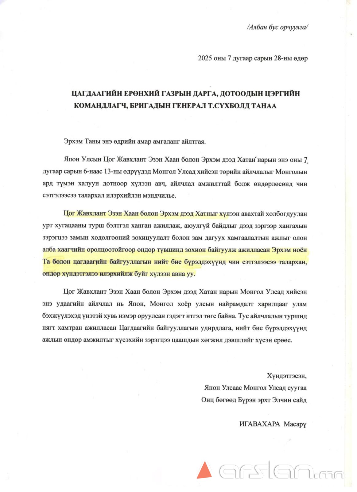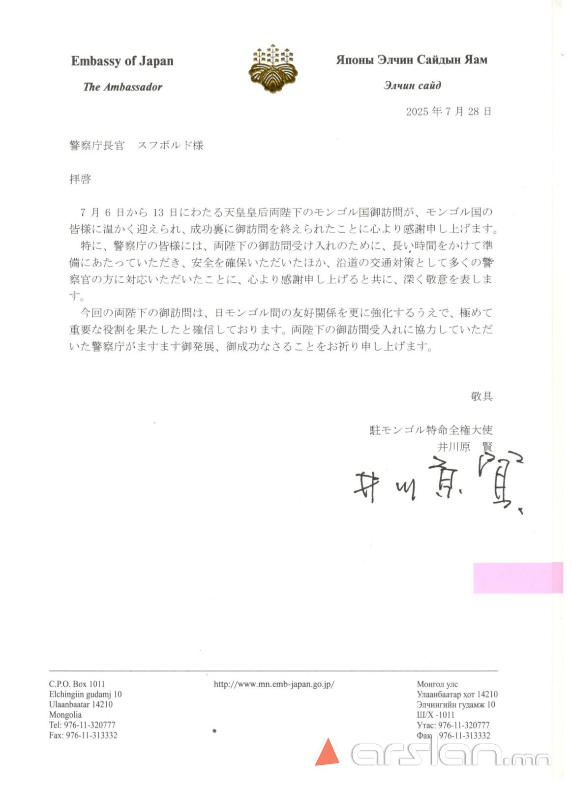 Япон Улсаас Монгол Улсад суугаа Онц бөгөөд Бүрэн эрхт Элчин сайд ноён Игавахара Масарүгээс цагдаагийн байгууллагын бие бүрэлдэхүүнд талархал илэрхийлжээ.
