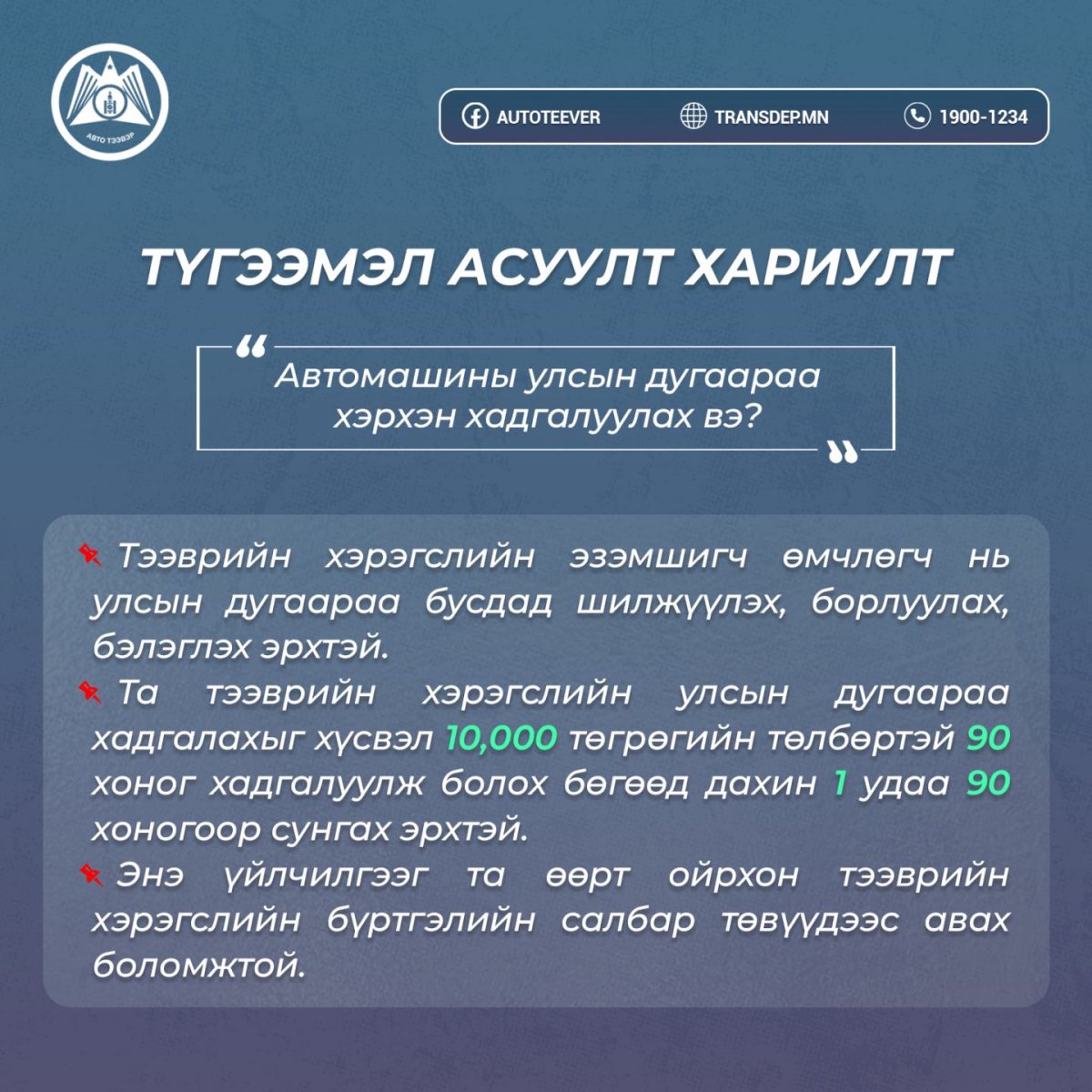 Тодруулбал, иргэн тээврийн хэрэгслийн улсын дугаараа хадгалахыг хүсвэл 10,000 төгрөг төлөөд 90 хоног хадгалуулж болно. Үүнийг дахин нэг удаа 90 хоногоор сунгах эрхтэй. Энэ үйлчилгээг өөрт ойрхон тээврийн хэрэгслийн бүртгэлийн салбар төвүүдээс авах боломжтой юм.