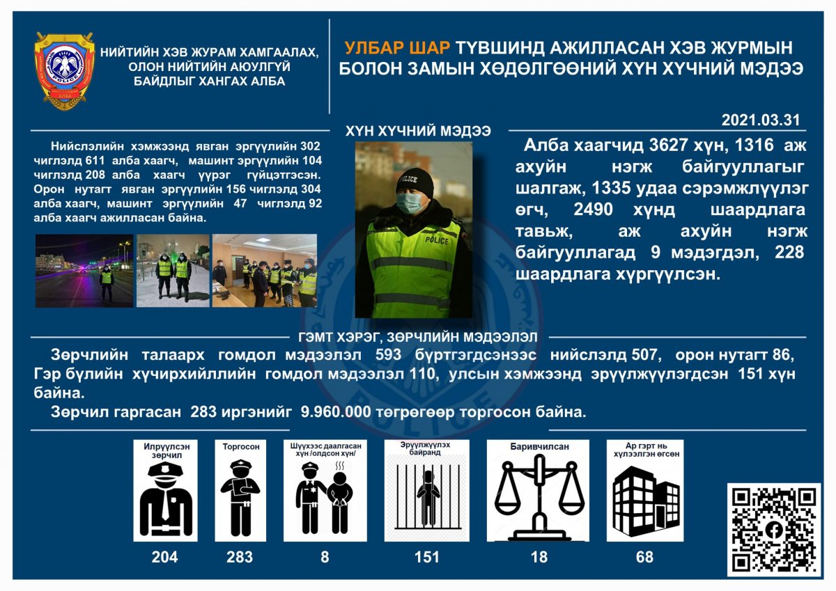 “Улбар шар” түвшинд шилжсэнтэй холбогдуулан нийслэлийн хэмжээнд явган эргүүлийн 302 чиглэлд 611 алба хаагч, машинт эргүүлийн 104 чиглэлд 208 алба хаагч үүрэг гүйцэтгэсэн.
